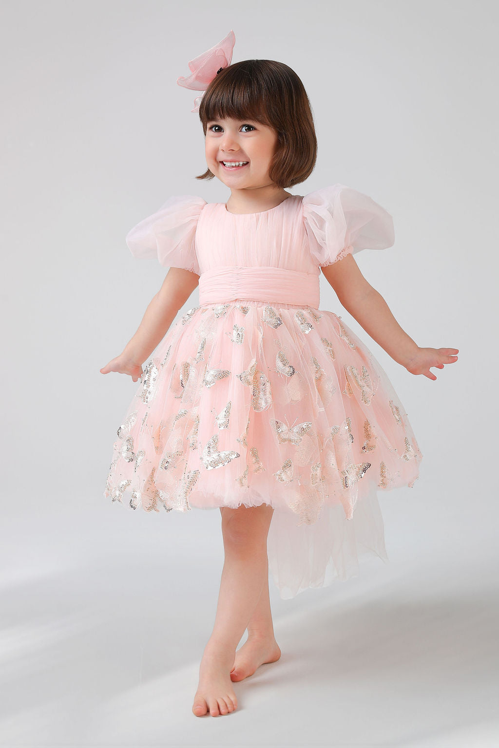 This flutter peach short dress is a gentle celebration of softness and childhood grace. The...