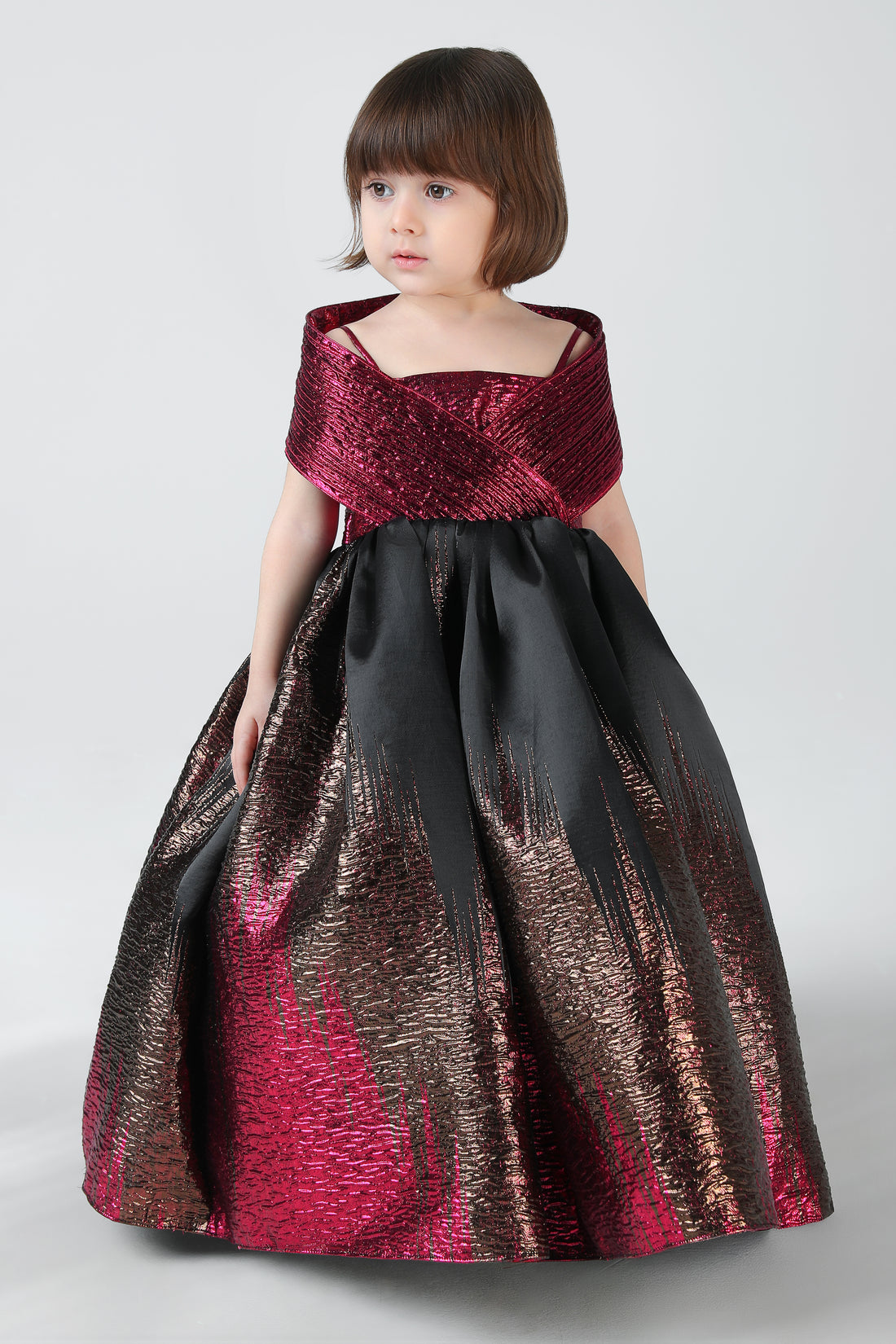 This graceful gown is thoughtfully designed with an elegant off-shoulder neckline crafted from a richly...