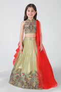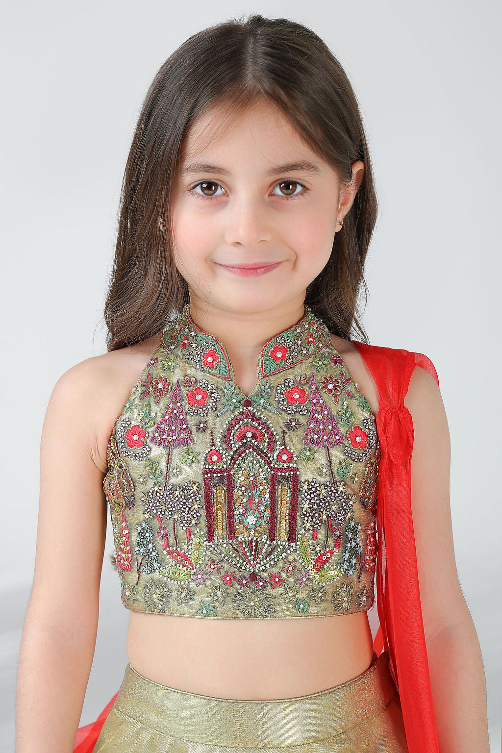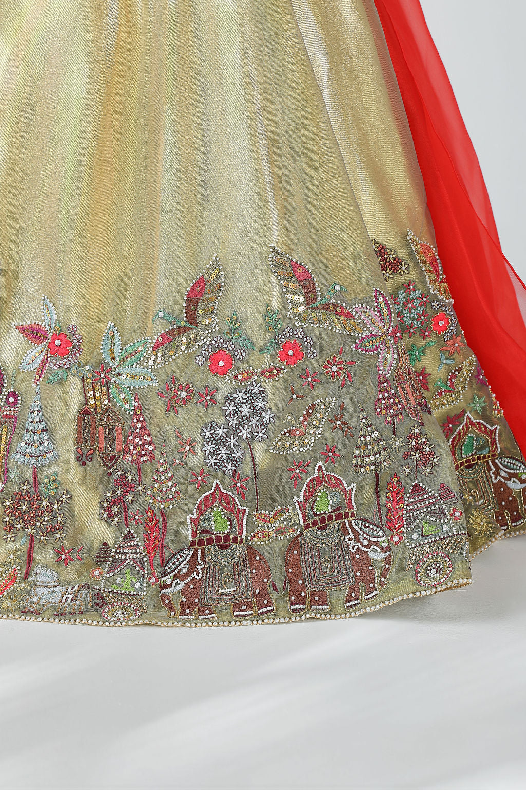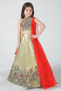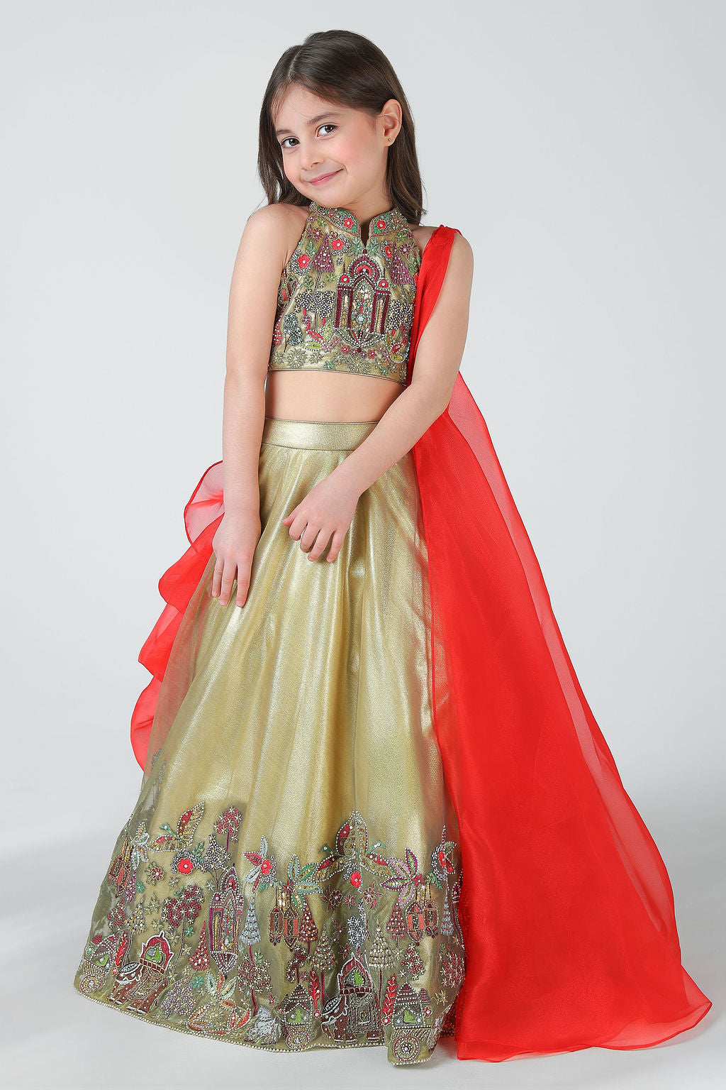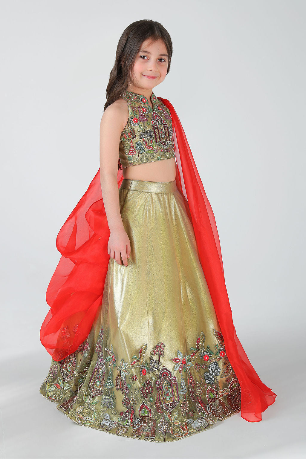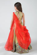 This exquisite lehenga set is a perfect blend of tradition and modern elegance, designed to make every celebration feel special. Crafted in a luxurious fabric with a soft golden sheen, the lehenga is fully lined with smooth satin, ensuring comfort, structure, and a graceful fall throughout wear.The blouse is beautifully hand-embellished, featuring intricate embroidery inspired by traditional motifs. Every detail is hand done, reflecting fine craftsmanship and adding depth and richness to the design. The top is finished with a neatly tailored back closure, ensuring a secure and comfortable fit while maintaining a clean, refined silhouette.The color combination of soft gold and vibrant red creates a striking yet harmonious contrast—gold lending elegance and warmth, while red adds a festive, celebratory touch. Completing the ensemble is a lightweight sheer dupatta, draped gracefully from the side. Its flowing fall adds movement and a dramatic flair without overpowering the outfit.The lehenga flows into a full-length, flared silhouette, enhanced with delicate hand embroidery along the hemline for a couture finish. Thoughtfully crafted and rich in detail, this ensemble is ideal for weddings, festive occasions, and special moments where timeless beauty meets handcrafted luxury .